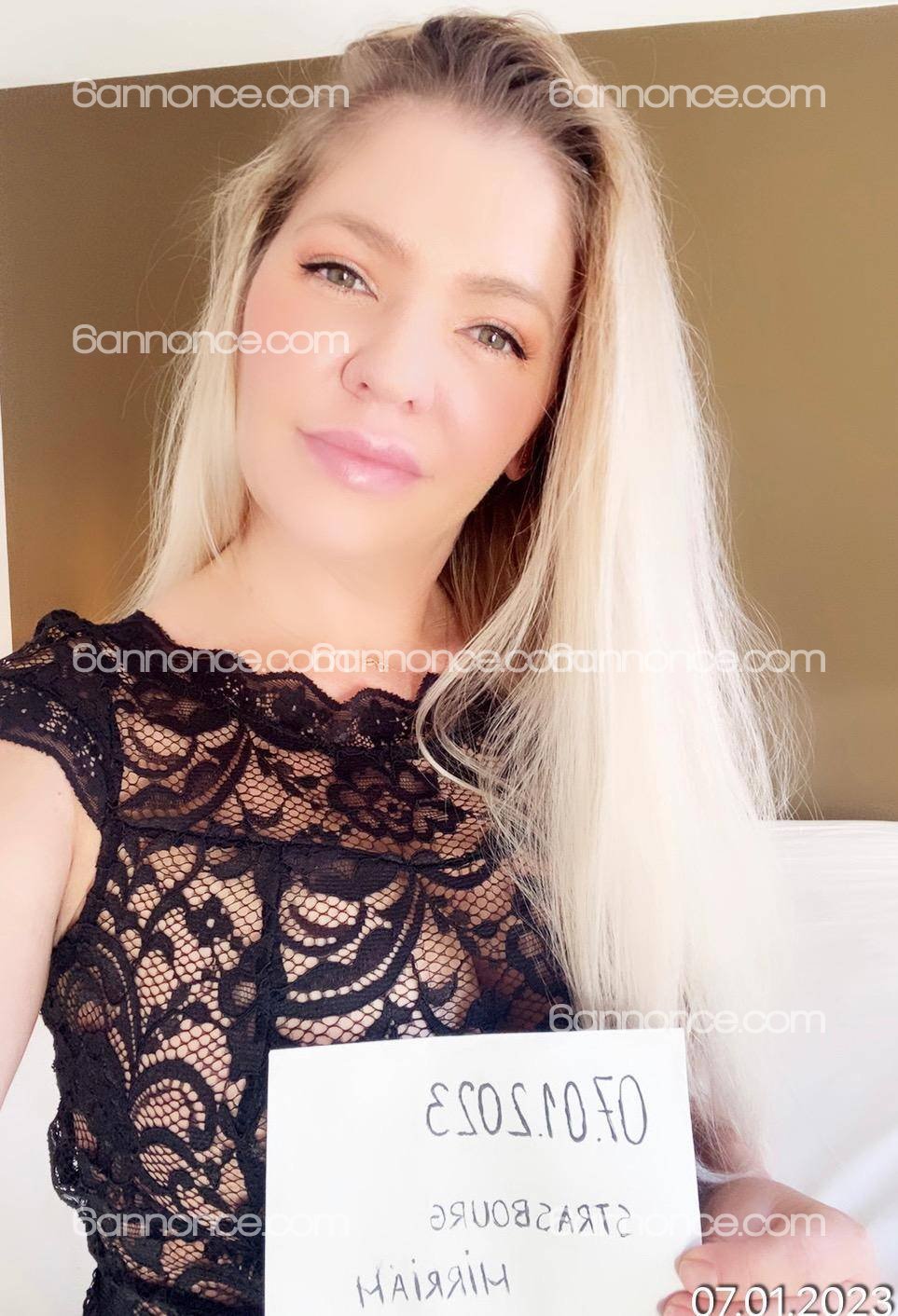 Cela fesait un petit moment que l'on ne s'ètait pas vu Mirriam et moi,nos retrouvailles n'en on ètait que plus belle et chaude.Comme à chacun de mes RDV,Mirriam me recoit avec de nouvelle tenue,cette fois,j'ai droit à Mirriam la soubrette,elle a mème oubliè sa petite culotte la coquine,ou l'a t elle oubliè volontairement,ce qui à eu un effet immediat sur ma virilitè.Un petit coucou à sa copine Laura (très sexy la petite)Je rejoins rapidement la belle blonde dans sa chambre.Les hostililè peuvent commencer:regards de braise(on va rester poli)mains baladeuses.Pour faire cours Mirriam m' offert un massage d'antologie,à très haute intensitè pour un final majestueux sur une levrette de fou de Dieu.ST agrèable autour d'une petite collation.Bref RDV parfait,avec une fille gèniale,que j'aurais plaisir à revoir sur la ville Rose.Gros bisous de moi belle MIRRIAM.Patrick.